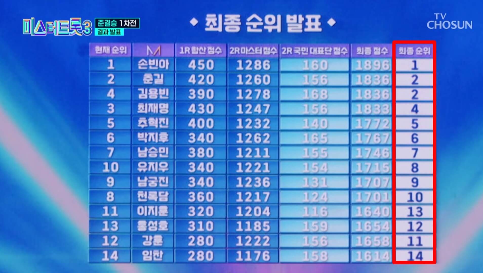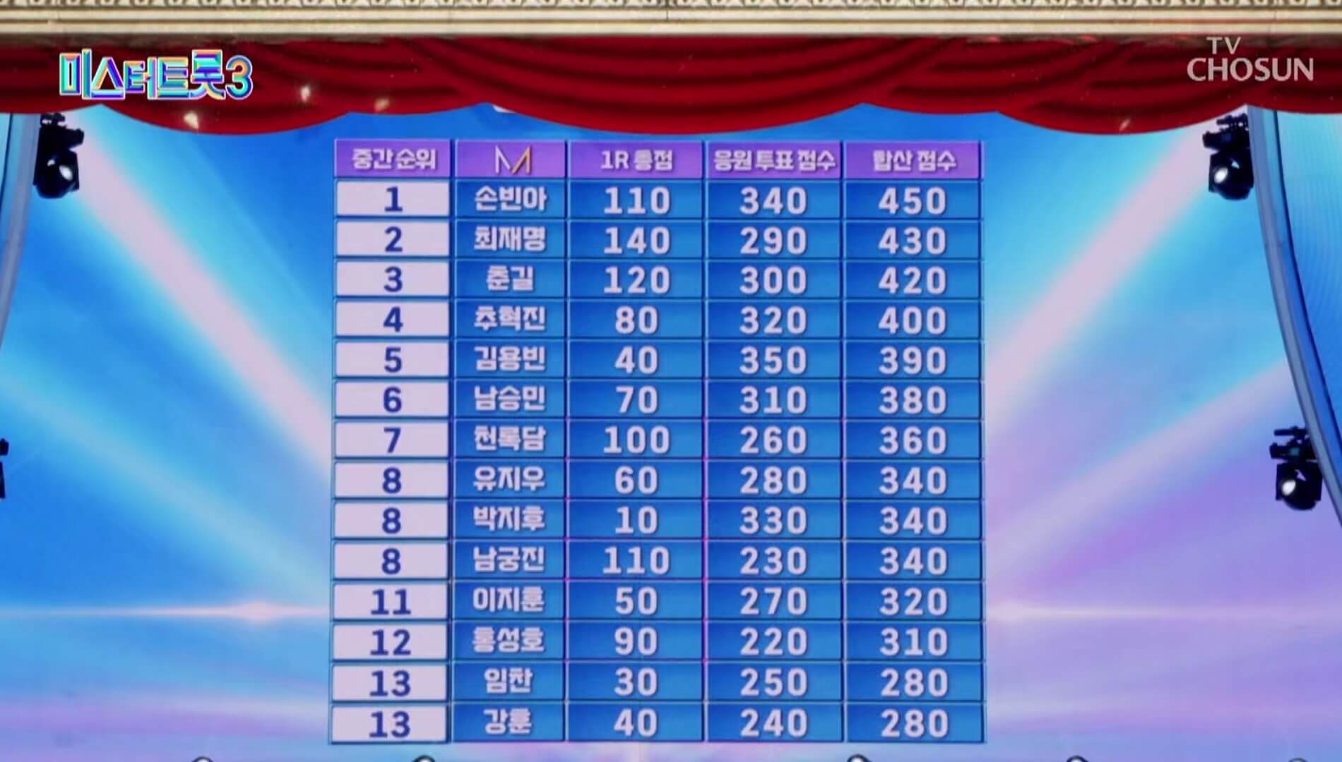 먼저 지난주에 펼쳐진 준결승 1차전 중간순위에서는 1위 손빈아, 2위 최재명, 3위 춘길, 4위 추혁진, 5위 김용빈, 6위 남승민, 7위 천록담, 공동 8위 유지우, 박지후, 남궁진, 11위 이지훈, 12위 홍성호, 공동 13위 임찬과 강훈 순으로 이름을 올렸었는데요~