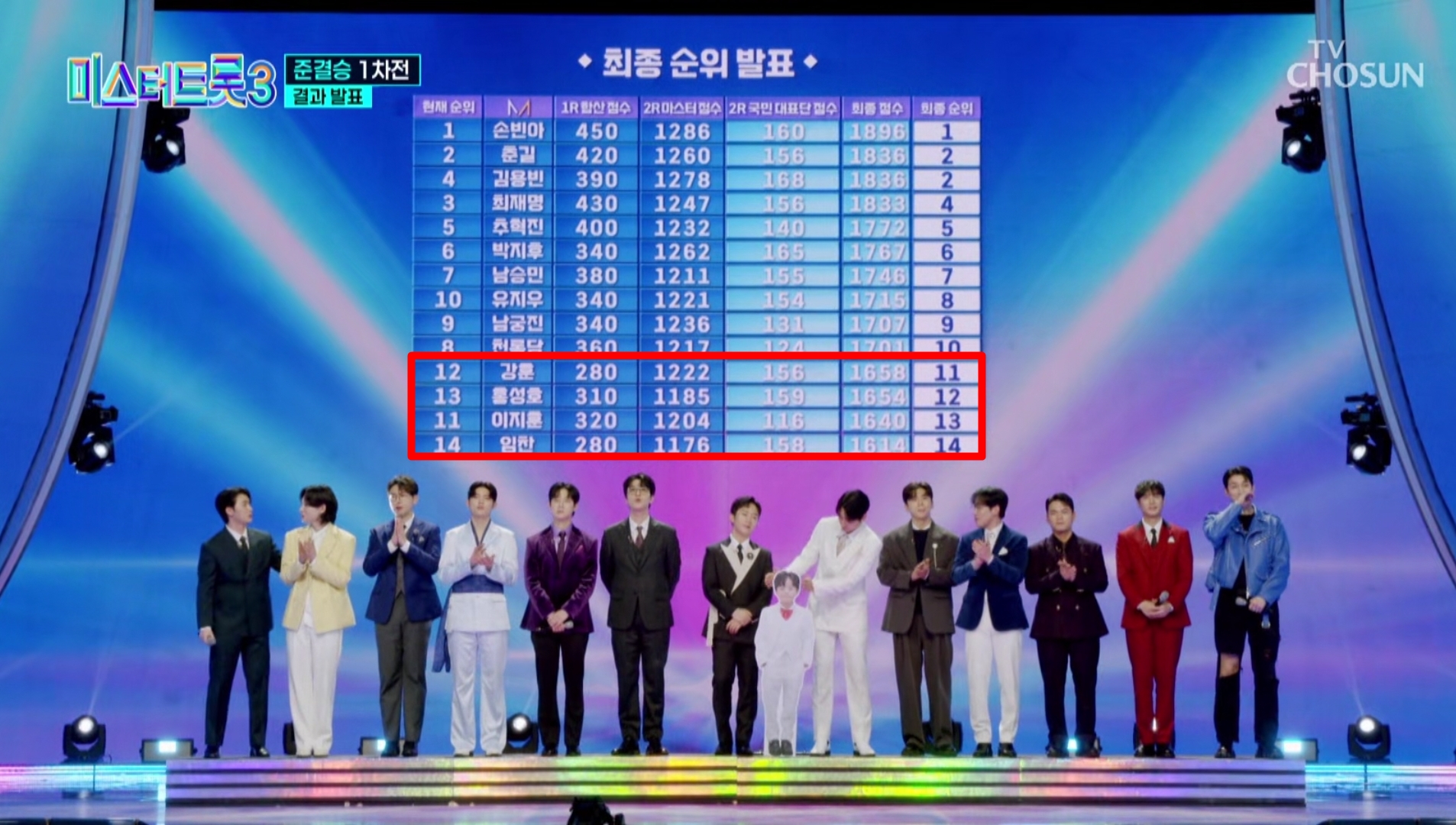 이로써 11위 강훈, 12위 홍성호, 13위 이지훈, 14위 임찬이 미스터 트롯3 탈락자 명단에 오르게 되었고, 1라운드 순위에서 미스터 트롯3 탈락자 후보였던 4인이 큰 이변 없이 아쉽게도 탈락하게 되었습니다. 그리고 이제 TOp10이 완성되어 다음 주 준결승전 2차에서는 TOP7을 향한 여정이 시작됩니다.