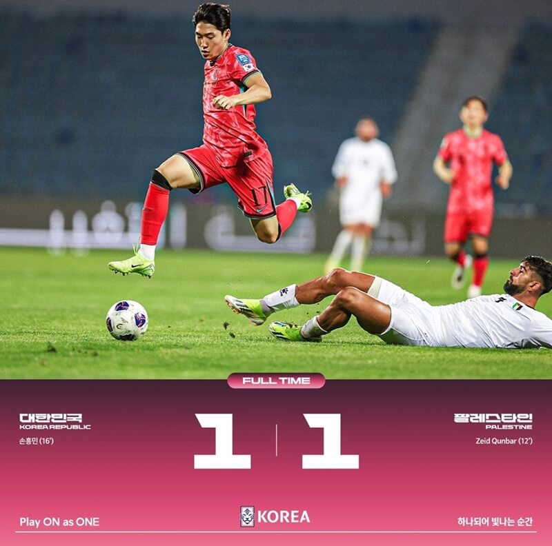 어제밤 한국 축구 결과 팔레스타인과 1대 1로 비겼습니다. 이로써 홈 1차전에서 0대 0으로 비겼던 무승부의 아쉬움을 만회하지 못했는데요~ 북중미 월드컵 아시아지역 3차 예선을 치르면서 6경기 무패 행진을 이어간 한국은 어제밤 한국 축구 결과가 무승부라 할지라도 여전히 승점 14점으로 B조 선두 자리를 지키고 있습니다.