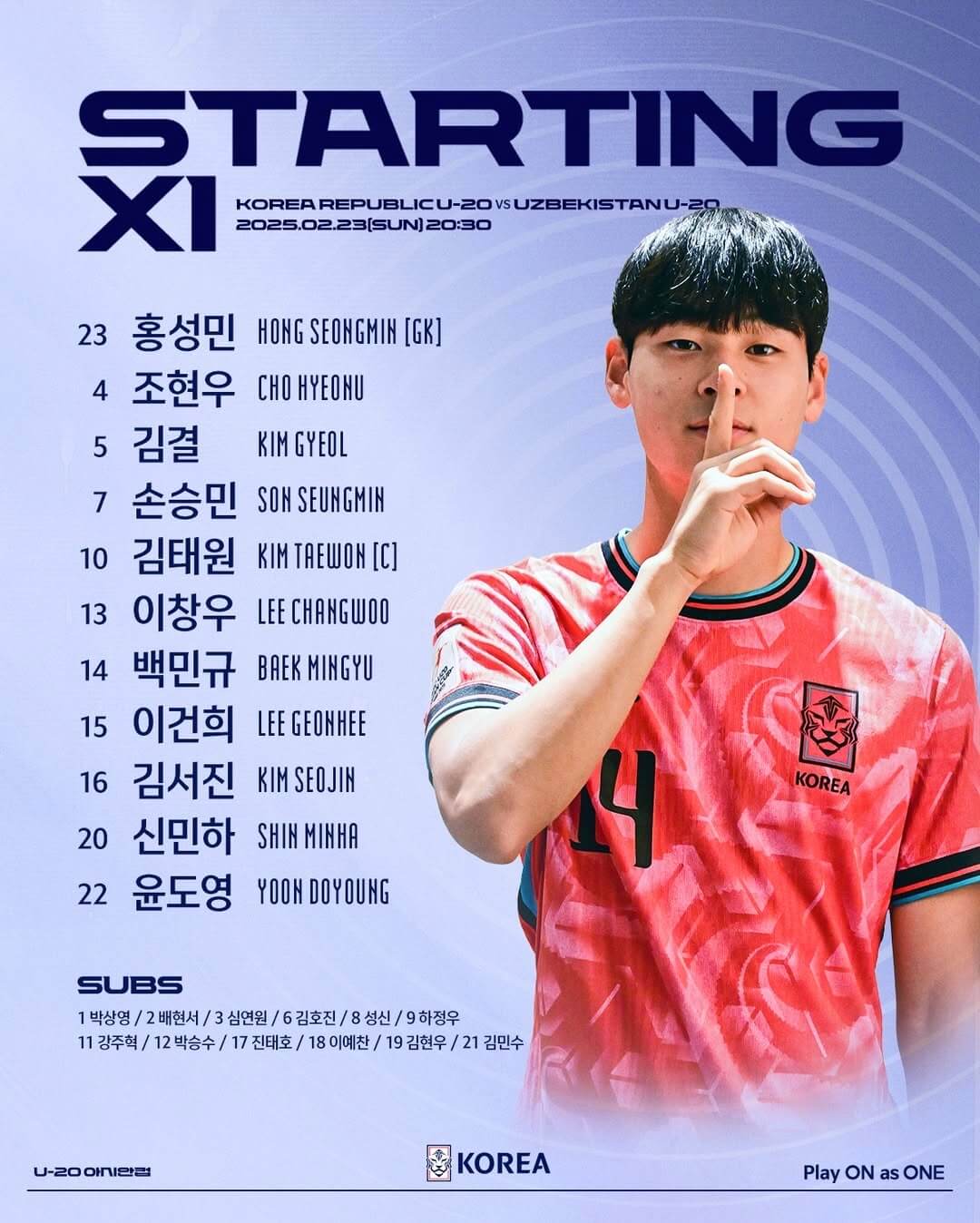 한국은 4-2-3-1 포메이션으로 김결, 백민규, 김태원, 윤도영, 이창우, 손승민, 김서진, 신민하, 조현우, 이건희, 홍성민이 선발로 나왔습니다. 그리고 우즈벡은 4-3-3 포메이션으로 주마예프, 카이다로프, 투흐사노프, 사이드누룰라예프, 하이룰라예프, 오린보예프, 하미도프, 압둘라예프, 주마토프, 툴쿤베코프, 소비로프가 선발로 출전했습니다.