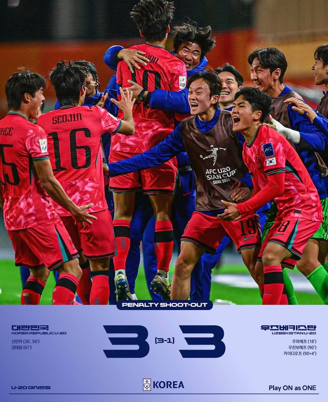 한국은 주장 김태원이 1번 키커로 나서 성공했고, 홍성민 골키퍼가 우즈백의 1번 키커의 공을 막아내면서 분위기를 가지고 왔습니다. 하지만 2번 키커로 나선 이건희의 킥이 골대를 때리면서 절망했지만 우즈벡 2번 키커의 킥도 골대를 넘어가면 다행스럽게 1대 0 리드를 지켰습니다. 3번 키커는 본경기에서 2골을 넣었던 신민하가 나섰지만 킥 조절을 잘못해 공을 하늘로 날렸고, 우즈벡은 3번 키커가 성공해 다시 1대 1 동점이 되었습니다.