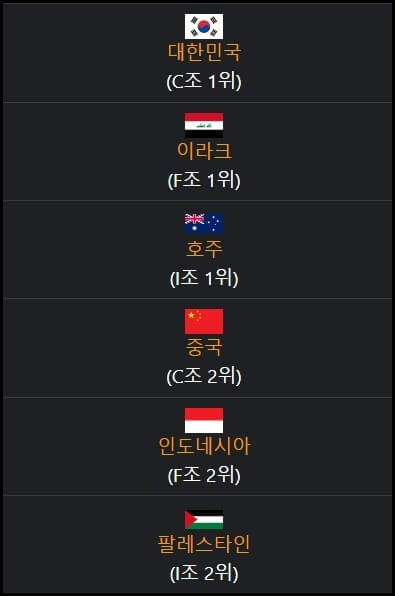 한국이 속해있는 B조에는 요르단, 이라크, 오만, 쿠웨이트, 팔레스타인이 속해있으며 B조는 1강, 2중, 3약 체제라고 볼 수있듯이 한국이 상대적으로 수월 대진표를 받았다고 볼수있습니다. 그리고 10월에 있었던 요르단과 이라크전에서 승리한 한국이 1위에 올라있습니다.