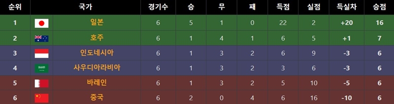 흡사 죽음의 조라고 볼수있 C조에는 일본, 호주, 사우디아라비아, 바레인, 인도네시아, 중국이 속해있는데요~ 역시나 조 1위 가능성을 가장 높게 봤던 일본이 조 1위를 지키고 있습니다.