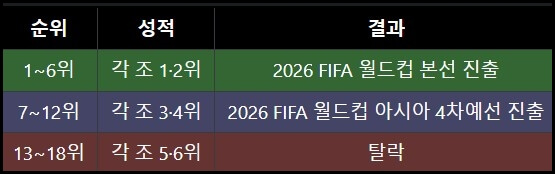 앞서 말했듯이 3개의 조에서 각조 1,2위는 2026 북중미 월드컵 본선에 진출하고, 각 조 3,4위는 월드컵 아시아 4차 예선에 진출하여 한차례 예선 경기를 더 해야 합니다.