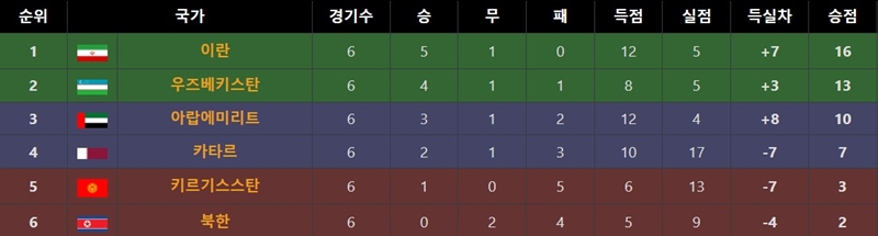 지금부터 본격적으로 월드컵 아시아 3차예선 조별 순위에 대해 알아보겠습니다. A조에는 이란, 우즈베키스탄, 아랍에미리트, 카타르, 키르기스스탄, 북한이 속해있는 조로 2강, 2중, 2약 체제라고 볼수 있습니다. 이란은 한국이 속해있는 B조보다는 아니지만 나름대로 편안한 대진표를 받았다고 볼수있으며 역시나 현재 월드컵 아시아 3차예선 조별 순위에서 1위를 지키고 있습니다.