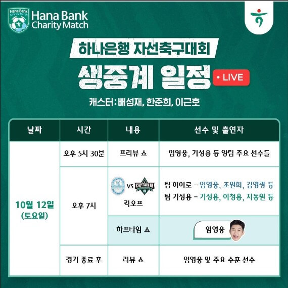 하나은행 자선축구 대회이자 쿠팡플레이와 함께하는 임영웅 축구에는 전현직에서 활동중인 전설적인 축구선수들과 인기 인플루언서들이 함께 하는데요~ 공개된 라인업을 보니 굉장히 반가운 이름들이 많이 보여서 더 기대가 되는 친선축구대회가 아닐까 싶습니다.