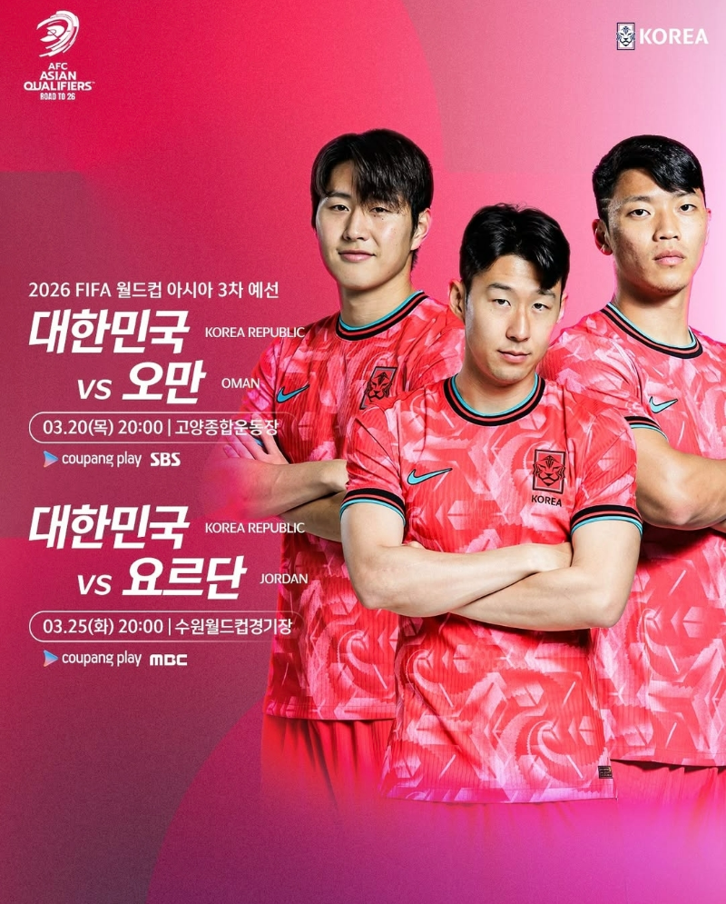 25년 3월에는 대한민국 국가대표팀의 북중미 월드컵 아시아 3차예선 경기가 두 차례 잡혀있습니다. 3월 20일에는 오만, 3월 25일에는 요르단과 격돌하는데요~ 두 경기 모두 홈에서 치러지는 경기로 쿠플뿐만 아니라 SBS, MBC에서 생중계되는데 한국 오만 축구 중계방송 채널은 SBS와 쿠팡 플레이, 한국 요르단 축구 중계방송 채널은 MBC와 쿠팡 플레이에서 중계됩니다.