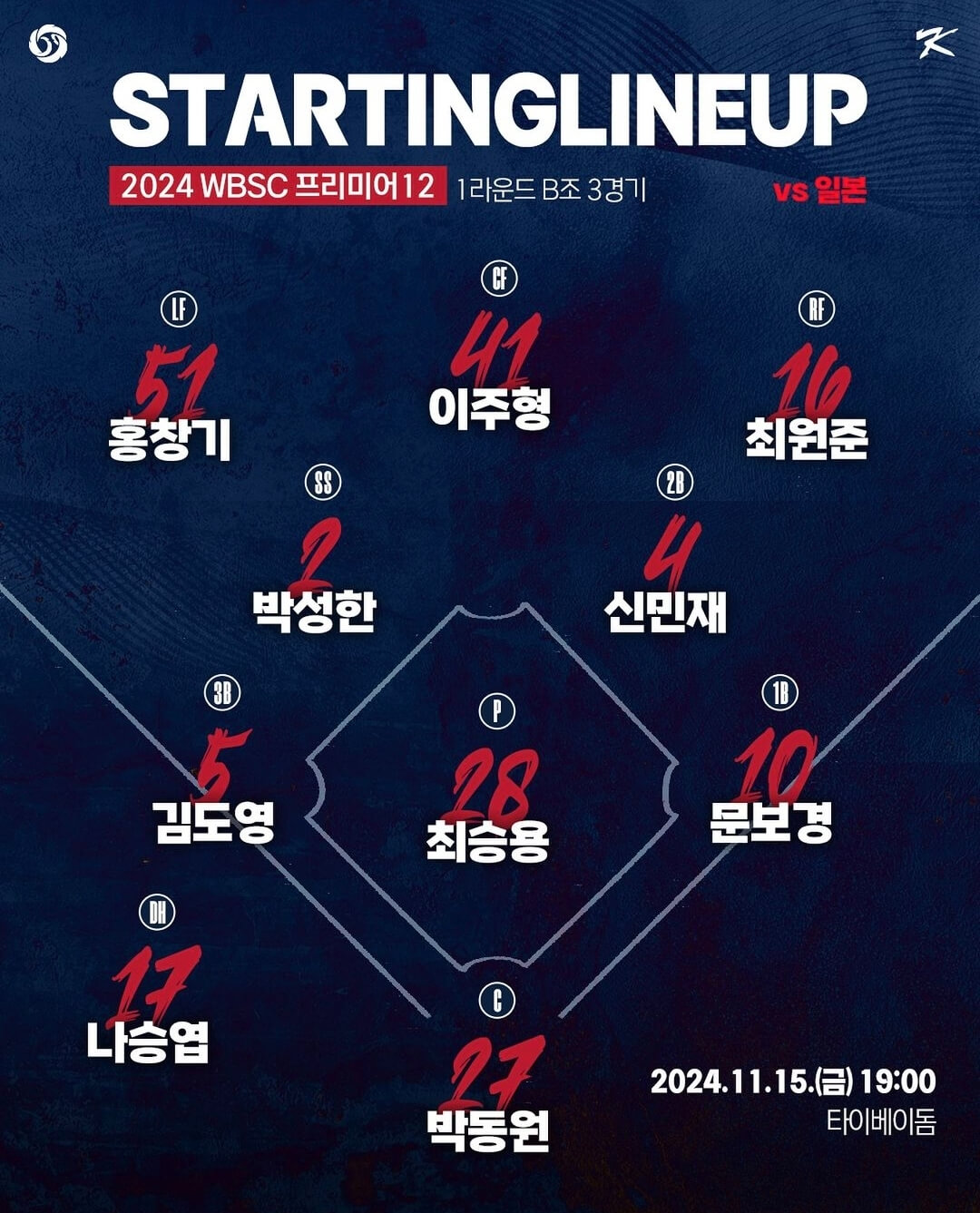 한국 일본 선발 라인업