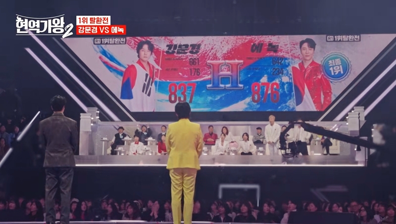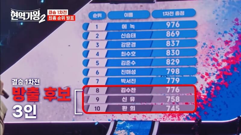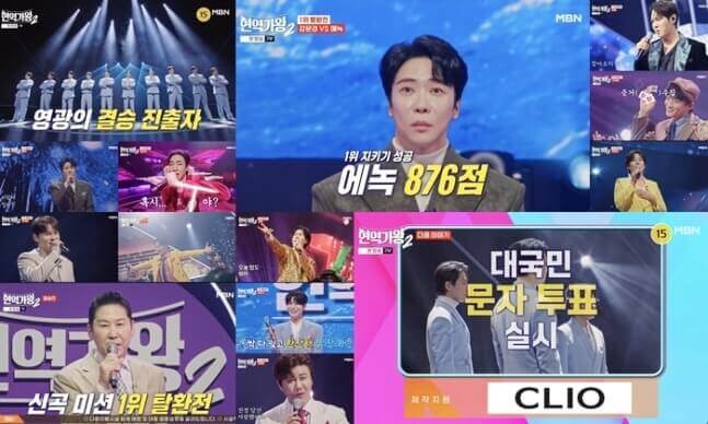 이로써 첫 번째로 무대에 오른 에녹이 결승 1라운드 현역가왕2 순위에서 마지막 순서까지 1위 자리를 단 한번도 뺏기지 않으면서 최종 1위에 등극했습니다. 그렇게 에녹은 자신의 점수 876점에 베네핏 점수 100점을 포함하여 총 976점으로 2라운드에 진출하면서 대역전극을 펼쳤습니다.