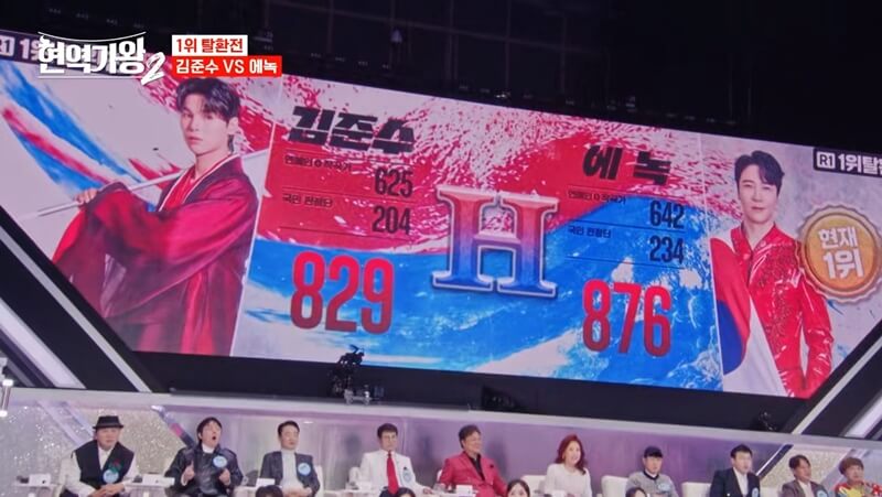술을 잘하지 못한다는 김준수는 송광호 작곡가의 '싹 다 잊고 한잔'을 선택하여 탁 트인 목청과 소맥 댄스로 무게감을 뺀 무대를 선사하면서 829점을 받았지만 에녹의 876점은 높았습니다.