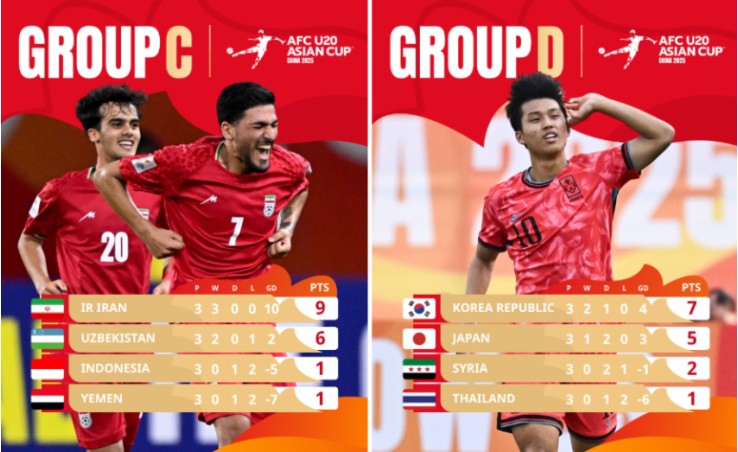 C조 1위는 이란, 2위 우즈벡, 3위 인도네시아, 4위 예멘 / D조 1위는 한국, 2위는 일본, 3위는 시리아, 4위는 태국으로 이란, 우즈벡, 한국, 일본이 8강에 진출했습니다.