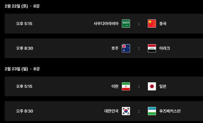 20세 이하 아시아 축구 경기 일정에서 한국이 우즈벡을 잡고 4강 또는 결승까지 진출한다는 가정하에 8강 경기는 2월 23일(일) 20:30분에 치르고, 4강 경기는 사우디 또는 중국과 2월 26일(수) 17:15분에 경기를 치르며 결승 경기는 3월 1일(토) 20:30분에 치릅니다.