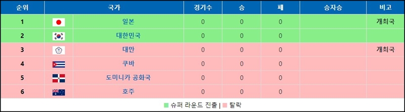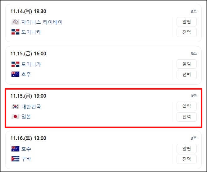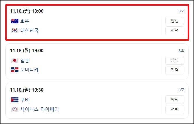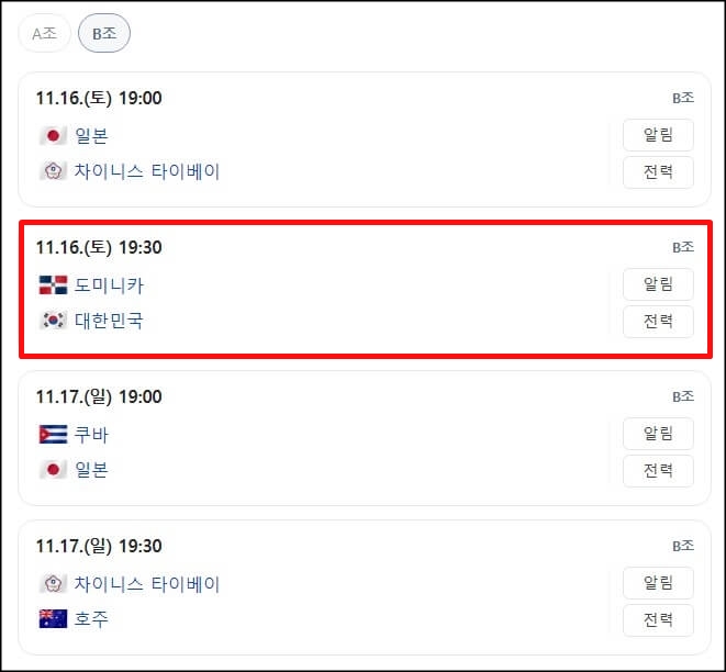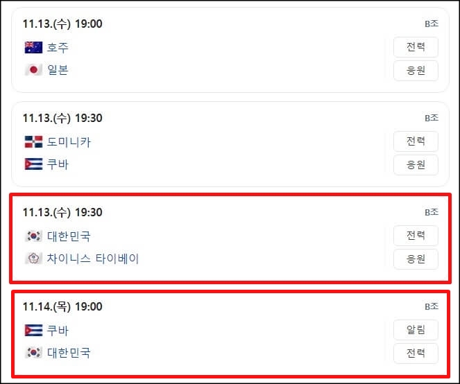 한국이 속해있는 B조는 11월 13일부터 11월 18일까지 일본의 나고야, 대만의 타이베이에서 경기를 치르고 WBSC 프리미어 12 조별리그에서 1,2위를 차지한 팀만이 슈퍼 라운드에 진출하게 됩니다.